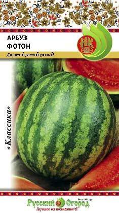Семена арбуза "Фотон" высевают в емкости в начале мая. Высадка рассады в открытый грунт в конце мая – начале июня (через 30-35 дней после всходов). Можно выращивать под пленочными укрытиями , тогда у растения удаляют все боковые побеги до высоты 50 см, а последующие прищипывают над 1-3 листом. Собирать урожай сорта семян арбуза "Фотон" можно через 82-109 дней. Плоды имеют слегка продолговатую форму. Корка ярко-салатового цвета, украшена рисунком в виде зеленых полос. Мякоть нежная, сладкая. Средняя масса плода до 4 кг.