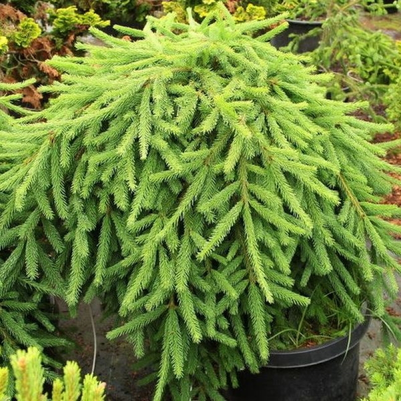 Саженцы ели обыкновенной Фробург (Frohburg) вырастают в стройные хвойные деревья с декоративным шлейфом из плакучих ветвей. Хвоя – дымчато-зеленая, короткая и жесткая. Одинаково эффектно смотрится в массовых посадках и как солитер.Ель обыкновенная Фробург вырастает на 10 см в год, и в 15 лет крупномер достигает 2-2,5м. Яйцевидные шишки из зеленых созревают в бордово-коричневые.