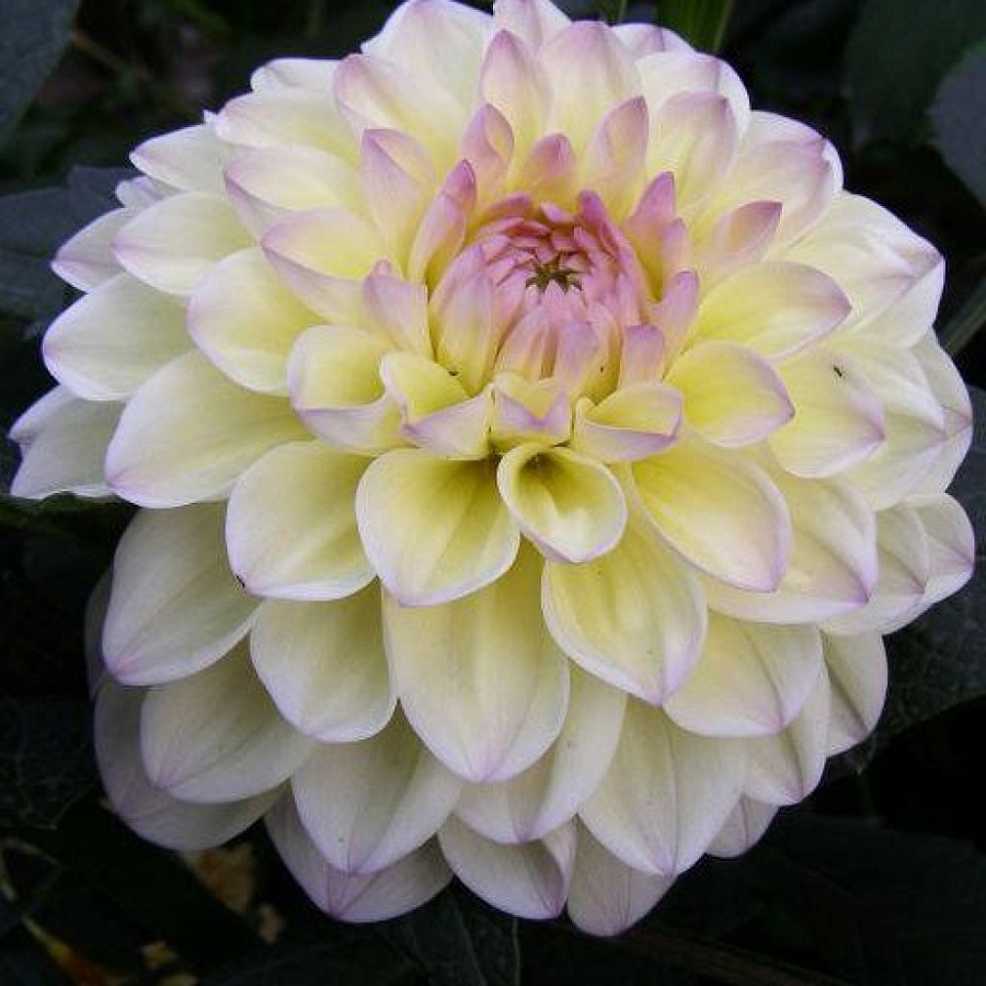 Георгина декоративная Лейк Кери - это великолепное растение с кремовыми цветками, украшенными нежными сиреневыми 'подпалинами' по краю лепестков. Ее стебель достигает высоты до 50 см, а размер цветка составляет 12 см. Листья георгины имеют интересную форму и образуют 7 лепестков. Это растение предпочитает солнечные места и дренированные богатые почвы.