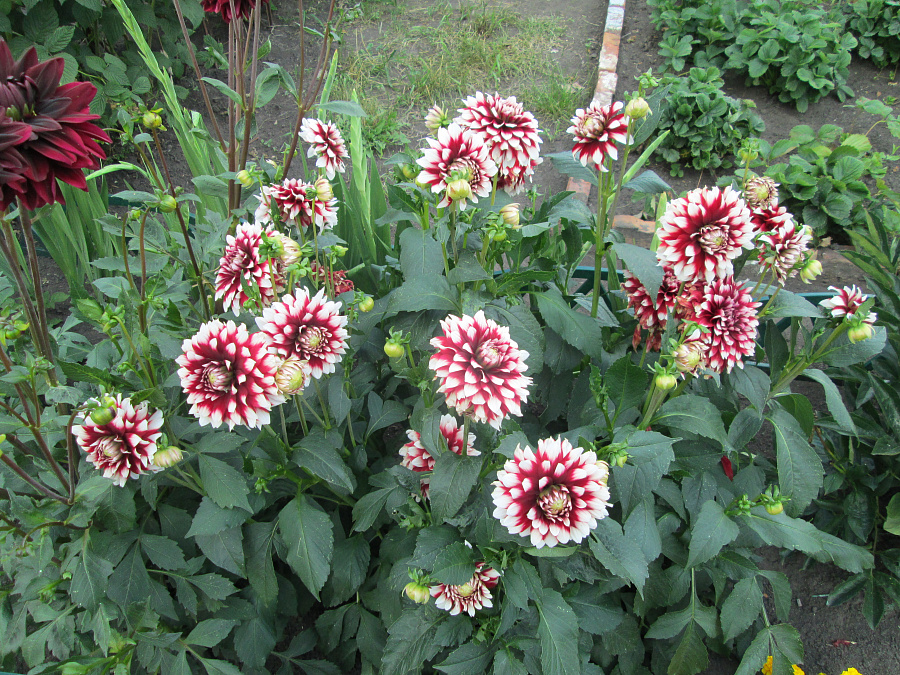 Цветы георгины Сидлер Штольце яркие и крупные, до 13 см в диаметре. У них ярко-бордовая сердцевина, от которой отходят одиночные плоские лепестки с плавным переходом цвета к белому. Цветы полностью махровые и немного отогнуты к стеблю — эта особенность делает соцветия очень пышными.