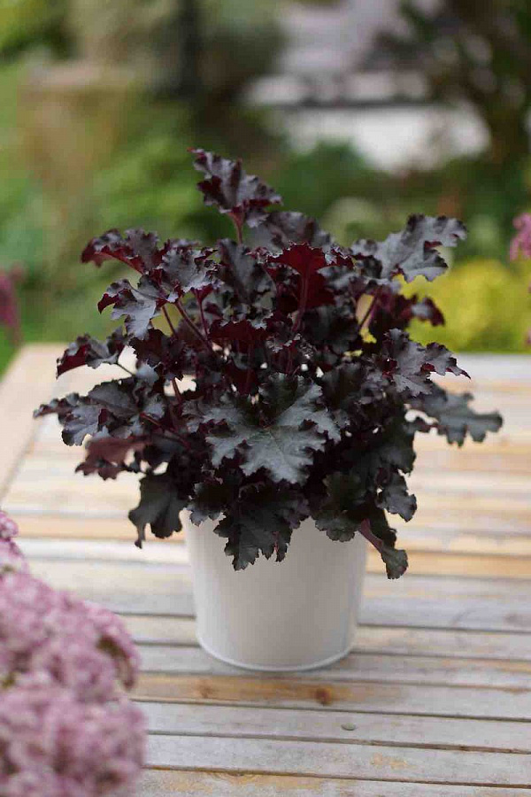 Рассада гейхеры Дарк Секрет (Dark Secret) обладает высокими декоративными данными. Этот сорт ценят за красоту гофрированных бронзово-пурпурных листьев и неприхотливость в уходе. Растение прекрасно смотрится с геранями, примулами, баданом и астибальдой. Летом многолетник цветет, выпуская стебли с маленькими кремовыми цветочками. Для посадки рассады гейхеры Дарк Секрет (Dark Secret) идеально подходят места с легкой полутенью. На открытом солнце растение будет нуждаться в дополнительном поливе, а в густой тени – окраска листвы потемнеет. Многолетник может оставаться на одном месте без пересадки до 4 лет.