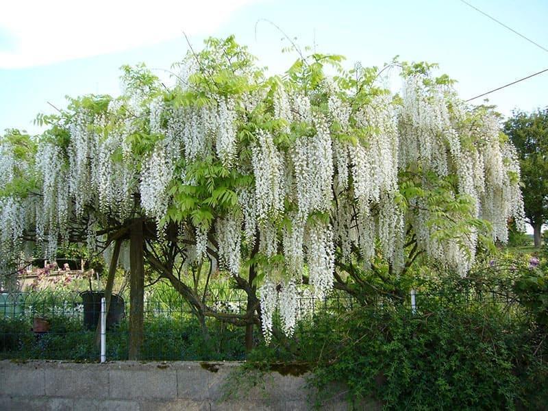 Саженцы глицинии китайской Alba пользуются огромной популярностью у садоводов и дизайнеров ландшафта. Взрослое деревце ежегодно вырастает на 1-2 метра, в конечном результате достигая 6 метров. В мае на повислых ветвях распускаются белоснежные цветы, которые повторно появляются в конце августа. Этот сорт отличается высокой декоративностью. Глициния китайская Alba предпочитает плодородную рыхлую почву. Выбирая место для посадки, следует отдать предпочтение хорошо освещенным участкам, защищенным от ветра. Растение нуждается в опоре, которую необходимо установить сразу после посадки.