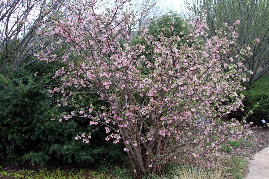 Саженцы калины Фаррера способны подарить ароматные розоватые соцветияс небольшими цветочками, которые зацветают еще до появления листвы. Оттенок только что распустившихся листьев бронзово-зеленый, но после он немного темнеет. Красные плоды чернеют. Срезанные веточки с цветочными почками часто ставят в доме, чтобы сполна насладиться чудесным сладковатым запахом, который распространяется на несколько метров.