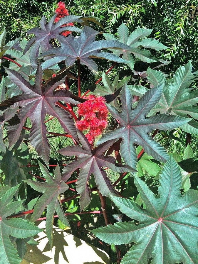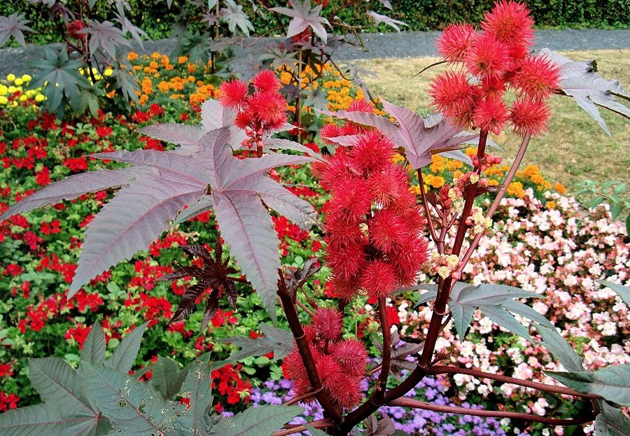 - маскировка бытовых строений и так далее. Рассада клещевины произрастает из шаровидных семенных коробок с прочной оболочкой и шипами. Эти своеобразные плоды весьма ядовиты, поэтому следует беречь детей от контакта с ними. Для посадки семян клещевины подходят солнечные участки плодородной почвы. Растению необходимо обеспечить защиту от ветра.