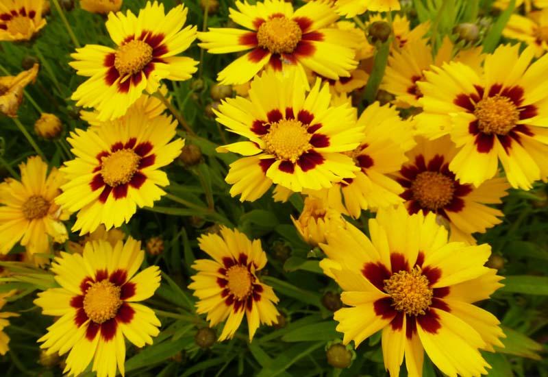 • неприхотливый в уходе и к составу почв. Цветок простой формы, но край лепестков резной, а их золотисто-желтый оттенок с бордовым основанием прекрасно гармонирует с сочно-зеленой листвой. Кореопсис ланцетовидный Бэби Голд в жаркие дни требует полив, так цветущий куст дольше сохраняет свой декоративный вид.