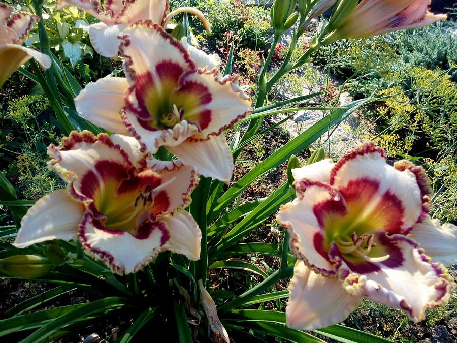 Рассада лилейника гибридного Lady Betty Fritz позволит вырастить элегантные цветы с оригинальной окраской: кремово-белые лепестки украшены широкими пурпурными мазками, а их волнистые края – такой же тонкой окантовкой. Горловина цветка, как и тычинки, имеют зеленовато-желтую окраску. Этот сорт можно выращивать для срезки и составления роскошных букетов. Рассада лилейника гибридного Lady Betty Fritz обладает теневыносливостью, но, чтобы добиться максимальной декоративности, следует размещать кусты на хорошо освещенных участках. Почва должна быть умеренно влажной, дренированной и плодородной.