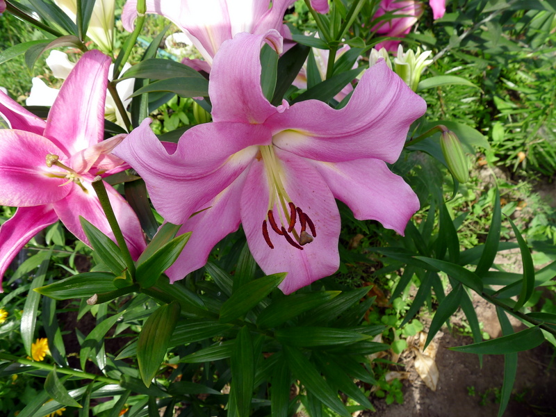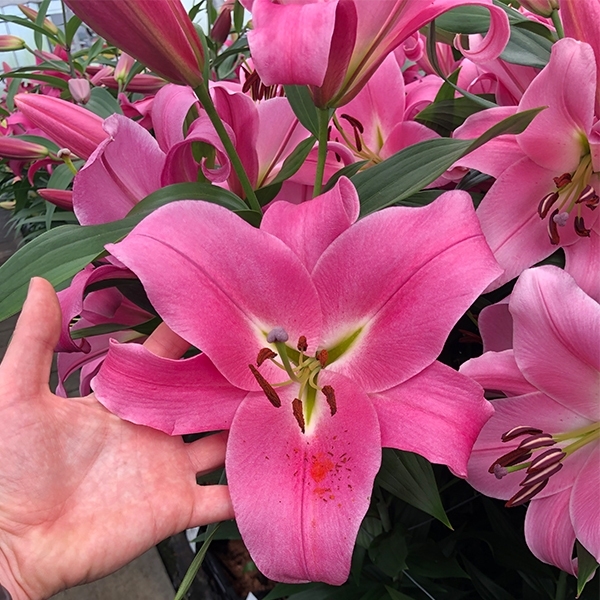 Луковицы лилии ОТ-гибрид Авентино (Lilium OT-hybrid Aventino) помогут раскрасить клумбу в яркие, но нежные цвета. Многолетник высотой до 130 см начинает цвести в середине лета и раскрывается множеством очень крупных, до 25 см в диаметре, сильно пахнущих цветков. На одном цветоносе образуется до 6 бутонов, которые раскрываются вверх и слегка в стороны. Окраска лепестка двуцветная. Основание ярко-желтое с выходящими к середине стрелками, из-за которых в сердцевине образуется симметричная шестиконечная звездочка. Остальная часть лепестка сочно-розовая, без примесей и крапа.