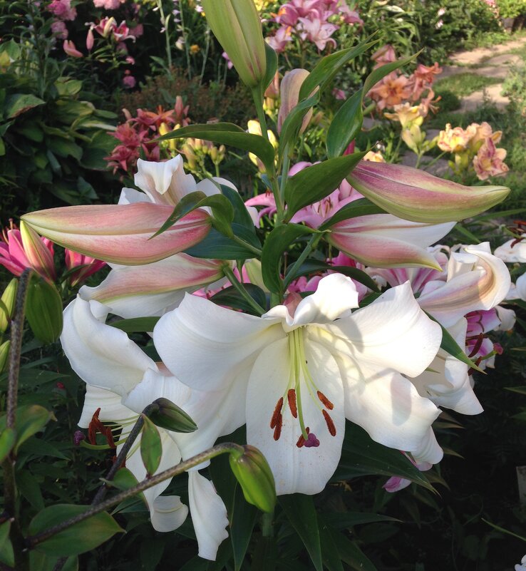 Окраска цветка : белые волнистые лепестки в контрасте с темно-оранжевыми пыльниками