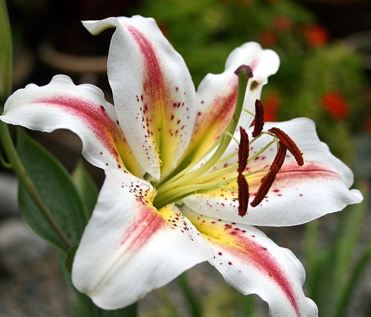 Луковицы лилии восточной Арена (Arena) вырастают в эффектно цветущие многолетники с нежным и тонким ароматом. На белых длинных лепестках соцветий красуются широкие полосы, которые переливаются от желтого до малинового оттенков. Особую яркость придают бордовые тычинки и крапинки в центре цветка. Прочные стебли по всей длине покрыты удлиненными зелеными листьями. Лилия восточная Арена эффектна на клумбе и долго стоит в срезке.