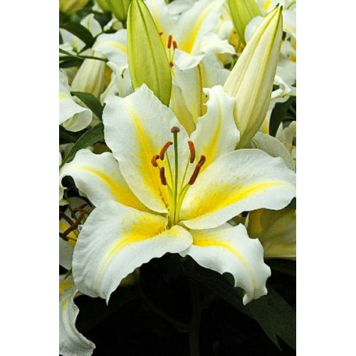 Лилия восточная горшечная Луция - это изысканное растение, которое поражает своей красотой и изяществом. Ее стебель достигает высоты до 45 см, а цветки белого цвета с бледно-желтой полоской радуют глаз размером до 25 см. Лепестки волнистые с загнутыми краями создают неповторимый образ, который наполнит ваш сад утонченным шармом.