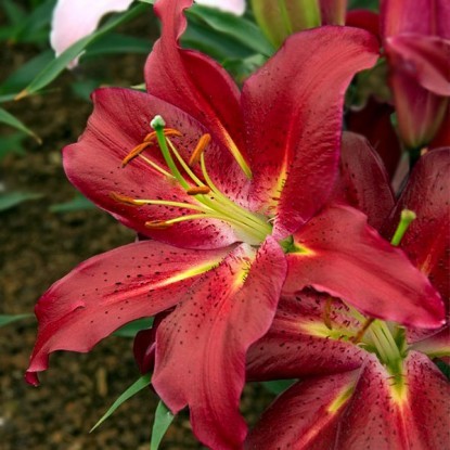 Лилия восточная "Коммитмент" - это великолепное растение, которое поразит вас своей красотой и изысканностью. Ее стебель достигает высоты до 100-120 см, а цветки красного цвета с темным крапом радуют глаз в течение 4-6 недель. Листья зеленого цвета имеют интересную форму, что делает лилию еще более привлекательной.