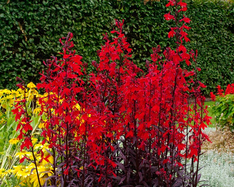Рассада лобелии огненной Королева Виктория (Queen Victoria) очень эффектно выглядит в саду, особенно по достижению поры цветения. Ее алые цветки диаметром около двух сантиметров составляют соцветие-свечку, контрастируют с длинными ланцетовидными листьями необычного бордового цвета с глянцевым отливом. Лобелия огненная – высокое растение, которое в хороших условиях вымахивает до 1,5 метра, поэтому ее можно использовать для заднего плана многоярусных садовых композиций, а также в конце сада, чтобы скрыть его необустроенные участки.