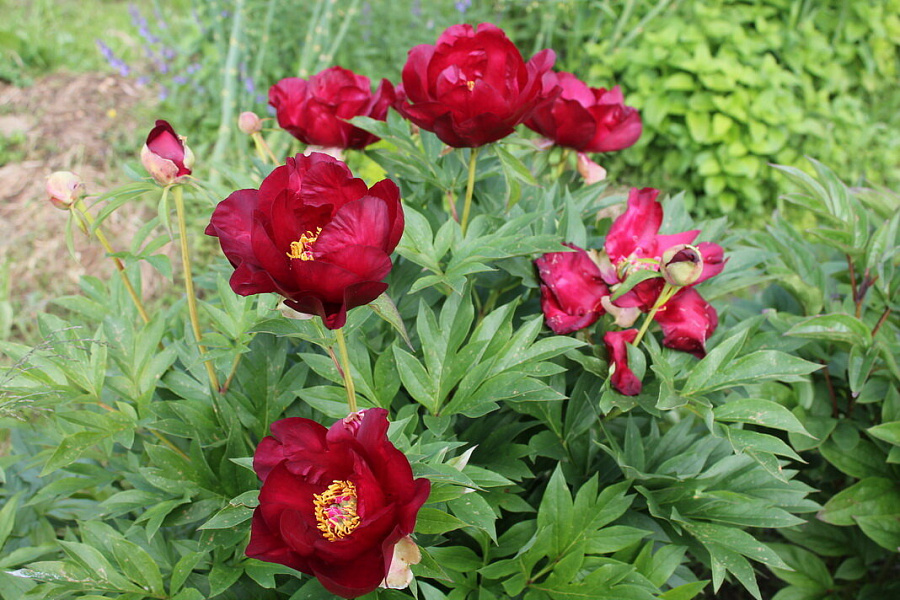 Рассада пиона ИТО Скарлет Хевэн (Scarlet Heaven): великолепный гибридный сорт с насыщенными темно-вишневыми цветами. Особый контраст соцветиям добавляют желтые пыльники. Лепестки переливаются и сияют, как рубины. Растение имеет форму раскидистого куста, высотой 80 см. Густая зеленая листва плотно расположена на прочных побегах. Сорт может размножаться делением, черенками и семенами. Особенности пиона Скарлет Хевэн: