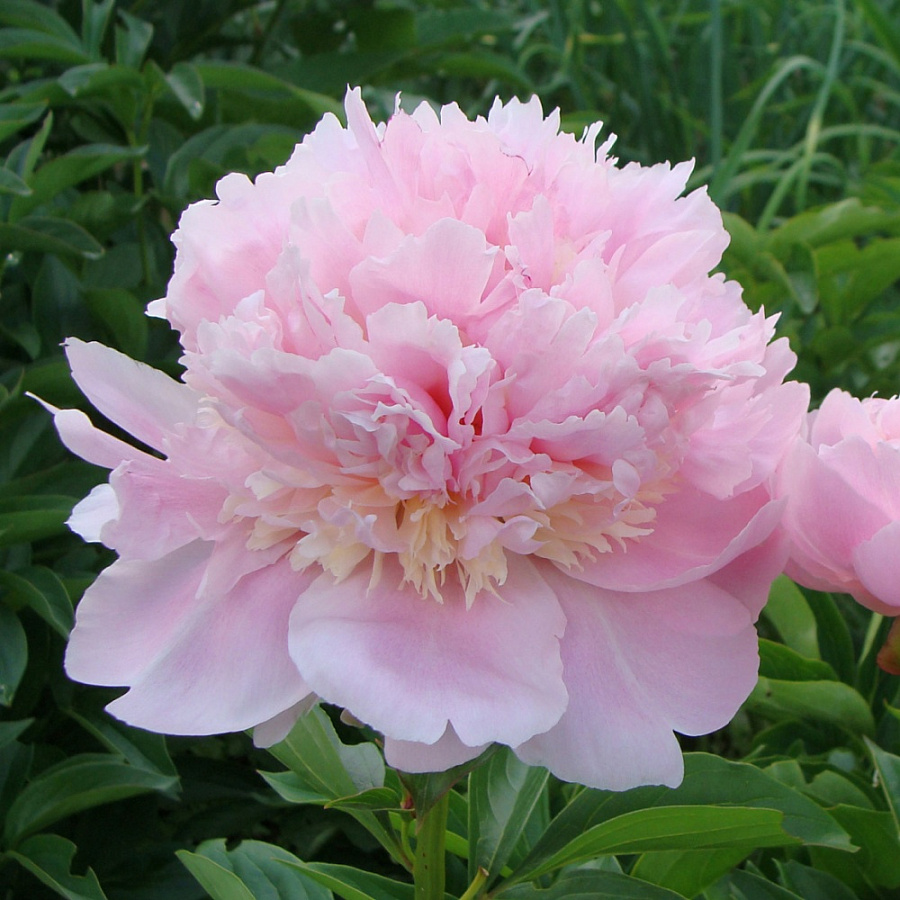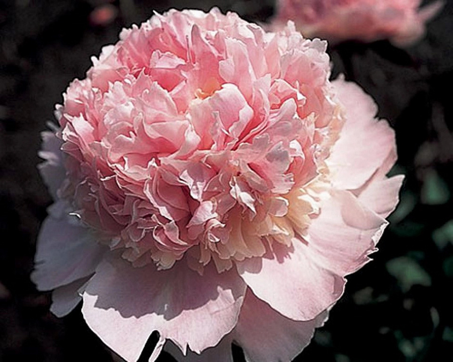 Пион сорта Angel Cheeks (Энджел Чикс) отличается своими махровыми бомбовидными цветами перламутрово-розового оттенка, с чуть более темной окантовкой. У них легкий приятный утонченный аромат. Срок цветения средний. Высаживать пион лучше на влажном хорошо дренированном грунте на открытых участках или в полутени. Стебли кустарника крепкие, вначале цветения аромат интенсивнее. Кустарник не переносит плотную почву. Пион Энджел Чикс отлично подойдет для украшения газона или создания смешанных композиций, также его часто используют для срезки и составления букетов. Цветение обильное, но иногда из-за объемных цветов стеблям нужна дополнительная опора.