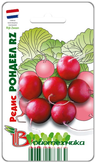 Семена редиса "Рондеел F1" (Rondeel F1) принадлежат к универсальному сорту, который подходит для выращивания в условиях открытого грунта. Высевать можно с середины весны до начала осени. Культура имеет сильный лист, поэтому рекомендуемая схема посева 10х5 см. Через 35-40 дней после появления массовых всходов созревают нежные, плотные, ярко-красные корнеплоды. Внутри они белоснежные, хрустящие, обладают слабоострым вкусом. Сорт обладает устойчивостью к цветушности, мучнистой росе и серой гнили. Используется урожай для потребления в свежем виде. Может долго храниться без потери товарных качеств.