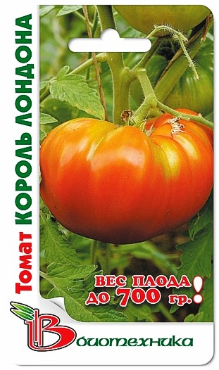 Семена томата "Король Лондона" (Korol Londona) относятся к среднераннему крупноплодному сорту сибирских селекционеров. Сорт выращивают в 1-2 стебля в пленочных теплицах и открытом грунте. Но во втором случае плоды получаются крупнее и ароматнее. Куст мощный, высота варьируется от 100 до 170 см. Плоды созревают малиново-красные, мясистые, красивой сердцевидной формы. Они очень крупные, средняя масса 400-700 грамм. Плоды великолепны в свежих салатах и различных заготовках на зиму. Могут долго храниться без потери вкусовых качеств.