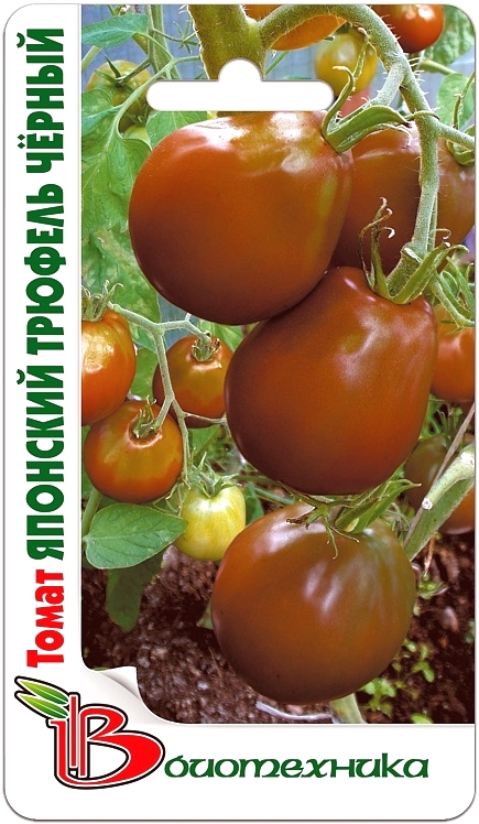 Семена томата "Японский трюфель черный" (Japonskij triufel chernyj) позволяют выращивать необычные красивые плоды. Помидорки имеют форму, напоминающую трюфель. Кожица окрашена в бордовый, темно-коричневый цвет. Урожай среднего размера, масса от 120 до 200 грамм. Он обладает высокими вкусовыми качествами. Собранный урожай может храниться длительное время и хорошо дозревает, если его срывать не достигшим сортовой зрелости. Урожайность сорта достаточно высокая, с одного куста можно собирать до 7 кг помидорок. Используется урожай для потребления в свежем виде.