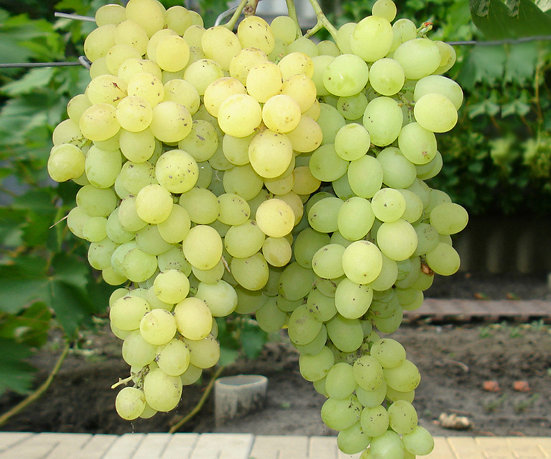 - Грозди средних размеров, конической формы, ягоды также среднего размера и округло-овальной формы и желтовато-зеленого цвета. Пригоден для как употребления сразу после сбора, так и для переработки – изготовления соков и вин.