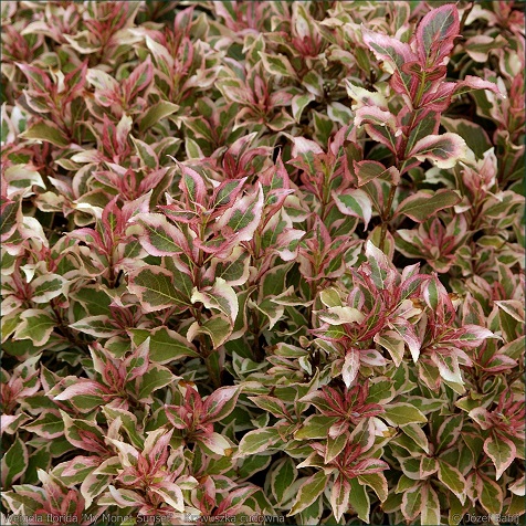 Саженцы Вейгелы цветущей Май Монет Сансет (Weigela florida My Monet Sunset) – это небольшой малогабаритный лиственный кустарник, закругленной формы. Овальные волнообразные листья располагаются вдоль тонких ветвей. Эти зеленые листья с красными и желтыми краями ближе к осени обретают привлекательные золотые и алые оттенки. Весной и летом кустарник цветет розовыми цветками.