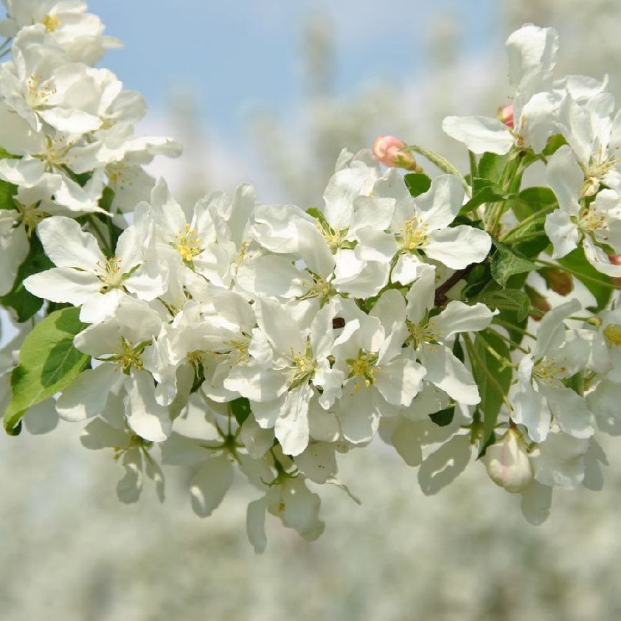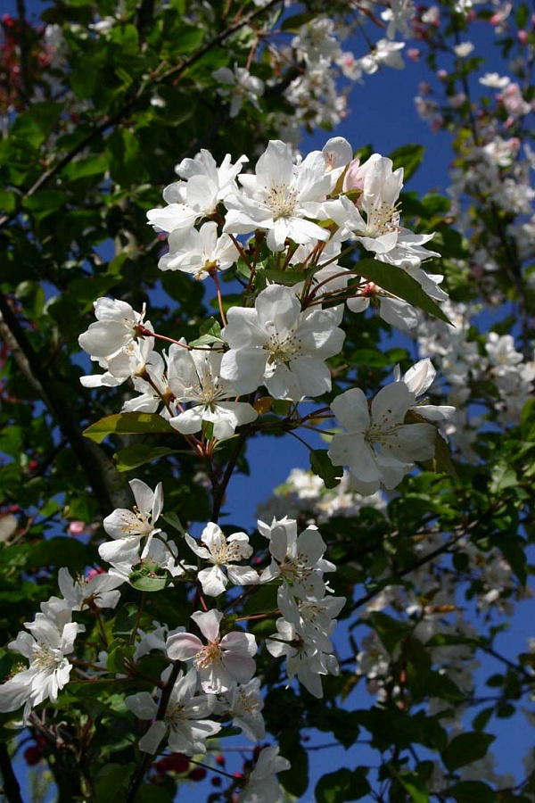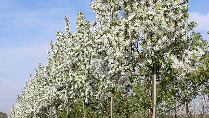 Саженцы яблони декоративной Стрит Парад (Street Parade) часто используются для создания аллей, живых изгородей и высаживаются на заднем плане цветников. Деревья, словно солдаты на параде, растут строго вверх, образуя стройное растение с колонновидной кроной высотой до 5 метров. В мае ветки обильно покрываются розовыми бутонами, а позже - белоснежными цветками, издающими нежный аромат. Плоды темно-красные, мелкие, растут пучками, остаются на побегах до глубокой осени. Сорт зимостоек и неприхотлив, прекрасно переносит загрязненный городской воздух и нехватку влаги в почве.