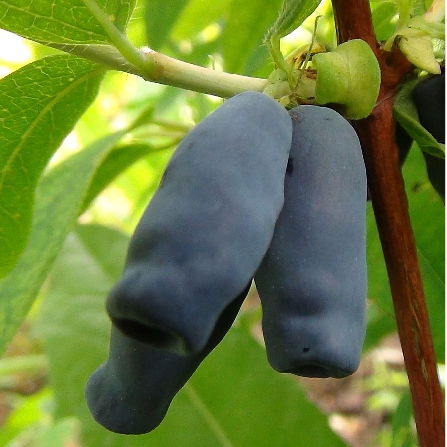Саженцы жимолости съедобной Уссульга (Ussulga) вырастают в мощное растение до 2 метров в высоту с небольшим штамбом и прямыми побегами. В конце июня на кусте дружно созревают веретеновидные голубые ягоды с восковым налетом на кожице. Их вес 2 грамма. Вкус сладкий с приятным кисловатым освежающим послевкусием, дегустационная оценка 4,9 балла. Урожайность от 3,5 до 5 килограмм с растения.